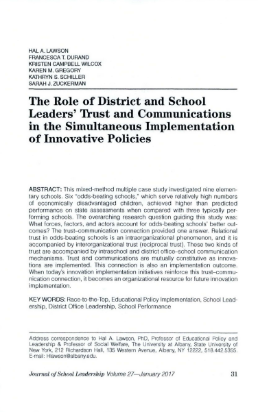 The Role of District and School Leaders’ Trust and Communications in the Simultaneous Implementation of Innovative Policies Date January 27, 2017 January 27, 2017 Click to read more! Read More
